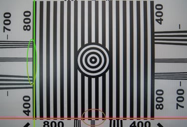 Appurato che si tratta di una lente praticamente priva di distorsione, ho voluto provare a distanza ravvicinata se la disposizione interna delle lenti va ad influenzare la distorsione. In una lente normale questo avviene, talvolta in maniera molto evidente. Ho tracciato dunque una linea verticale verde perfettamente in angolo retto con il bordo dell'immagine ed una rossa orizzontale sempre perfettamente in angolo retto con il bordo.