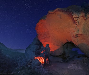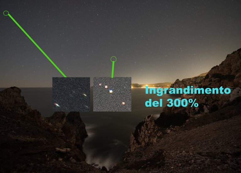 Quando andiamo a scattare una fotografia di paesaggio come questa, solitamente cerchiamo un compromesso fra le parti da mettere a fuoco, altrimenti dovremo necessariamente dedicare due scatti per avere tutto perfettamente a fuoco. In questo caso, dunque, ho cercato di scattare in "iperfocale" (per quanto ad ƒ/4 sia abbastanza arduo parlare di questo...) posizionando il fuoco tra 2 e 5 mt nella scala dell'obiettivo (considerando sia che non ho parti molto vicine al punto di presa che m'interessa abbiano un dettaglio perfetto, sia che il mio interesse è quello di avere i fondamentali delle colline a fuoco). Da quel che si può vedere, nel suo insieme le stelle sono abbastanza omogenee considerando lo scatto nella sua interezza ma, se andiamo a zoomare, notiamo che ci sono delle disparità tra centro e bordo lente (anche se dobbiamo impegnarci un pò, come puoi leggere è un ingrandimento del 300%). Questo quindi ci porta a giudicare la lente "non ottimale per fotografia notturna" anche se comunque buona in resa generale. é giusto? A mio avviso no: di notte non possiamo ottenere tutto perfetto con un solo scatto, neanche con ottiche dedicate, specialmente se decidiamo di lavorare più sul suolo che sul cielo!