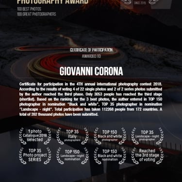 2018 Professional Honorable mention, landscape category, at Monochrome Awards, name pubblication in 2018 catalogue
